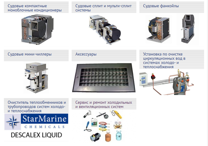 Всё климатическое оборудование поставляется на территорию РФ под торговой маркой. В линейку стандартного оборудования завода входят судовые компактные моноблочные кондиционеры, судовые сплит- и мульти-сплит системы, судовые мини-чиллеры и фанкойлы. Кроме того любое оборудование может быть спроектировано и изготовлено по индивидуальному техническому заданию.